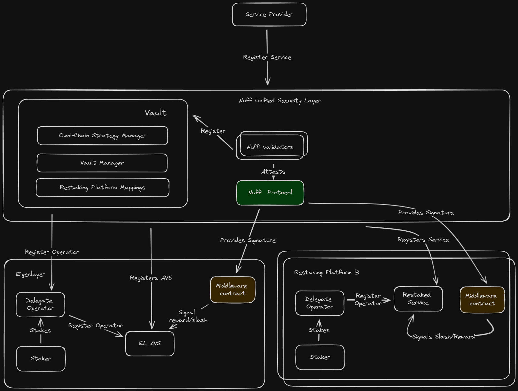 - Missed opportunity: Blockchain protocols that do not have a native restaking layer miss out on the chance to provide restaked security to their builders. To access the systems, they must integrate with them cross-chain and build expertise in each restaking system they want to support. This introduces opportunity cost, risk, and auditing requirements for the protocol. With a system where native delegates lock up their stake, and operators lock their validating keys to a Smart Contract on the native chain, they can delegate to the unification layer to attest for them based on their strategy.