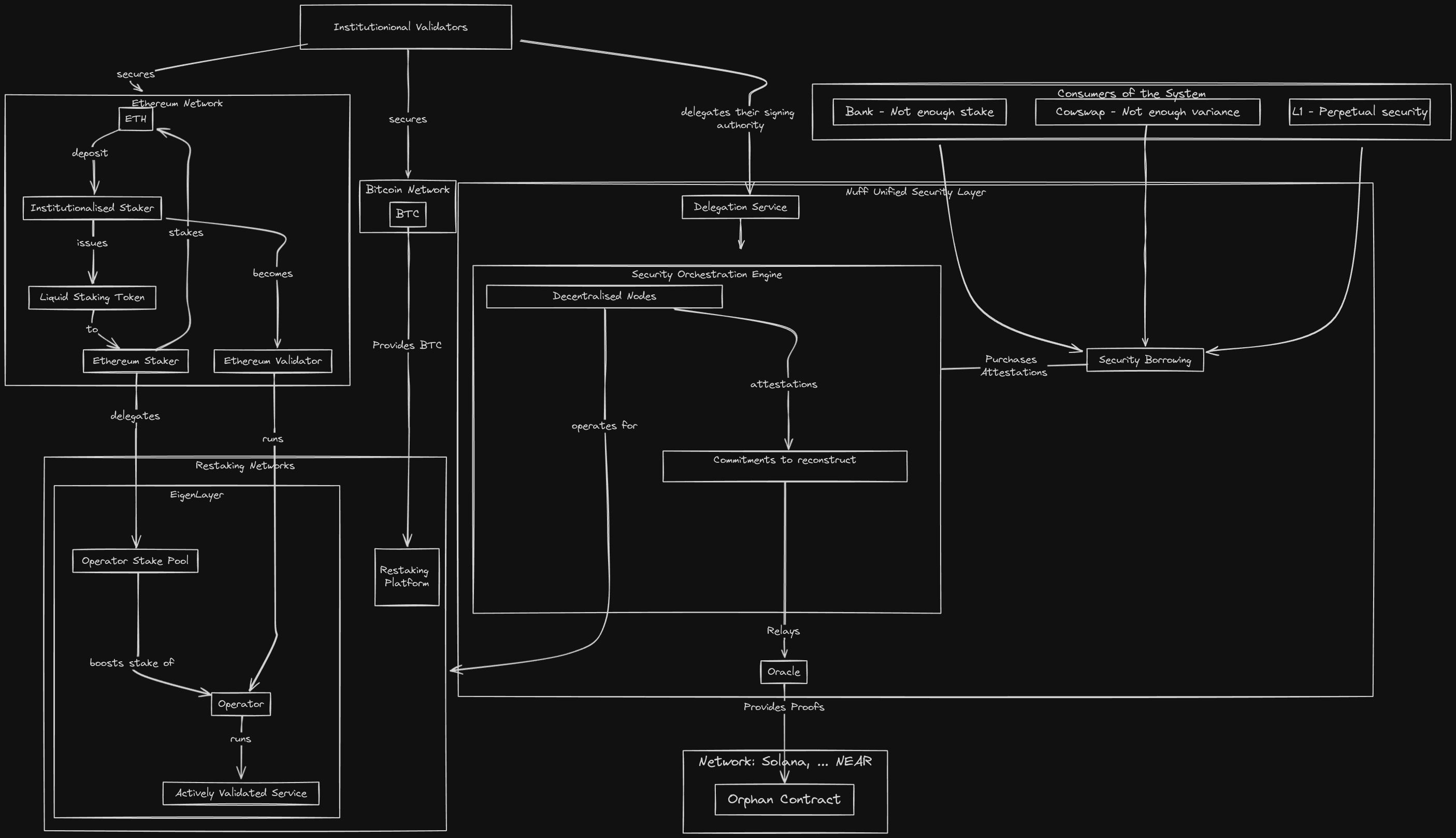 - Introduce a unification layer for the agents in each security system to pool their attestations and aggregate them. This system would utilise the expertise of builders who understand the restaking paradigm and limit the burden on the external actors who want to purchase security, freeing them up to concentrate on their value generation. For operators, allowing them to become delegates means they can delegate all of their assets to a trustless operator set. Utilise account abstraction to ensure the attestation is delegated to the unification layer.