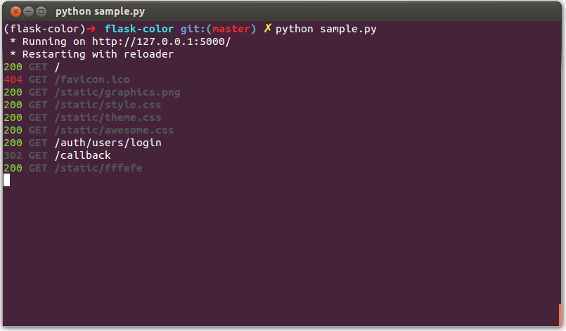 flask.ext.color.init_app(app)Flask configuration DEBUG must be True for this extension to function. You can override this by setting COLOR_ALWAYS_ON true.