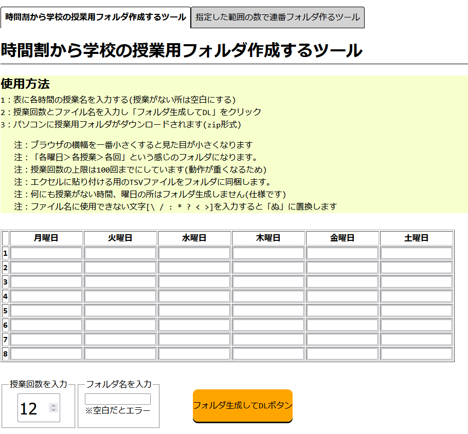 「各曜日>各授業>各回」という構造のフォルダを生成します。