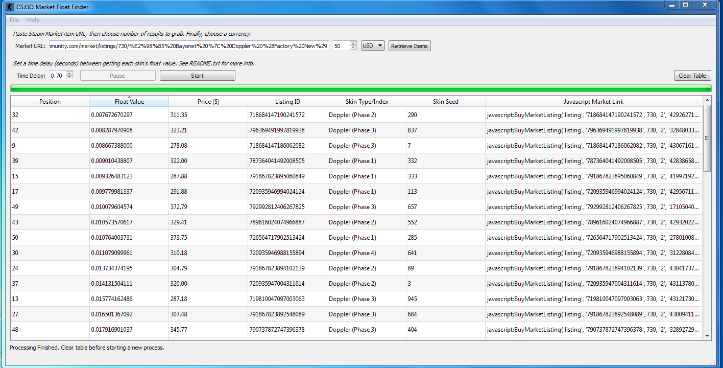 Once the processing has finished you need to filter by float value to find the lowest one, and then take note of that item's position. The position represents the item's place in the Steam market at the time of gathering the data. If this position says '27' for example, it will be on the second page since Steam displays 10 items per page.
