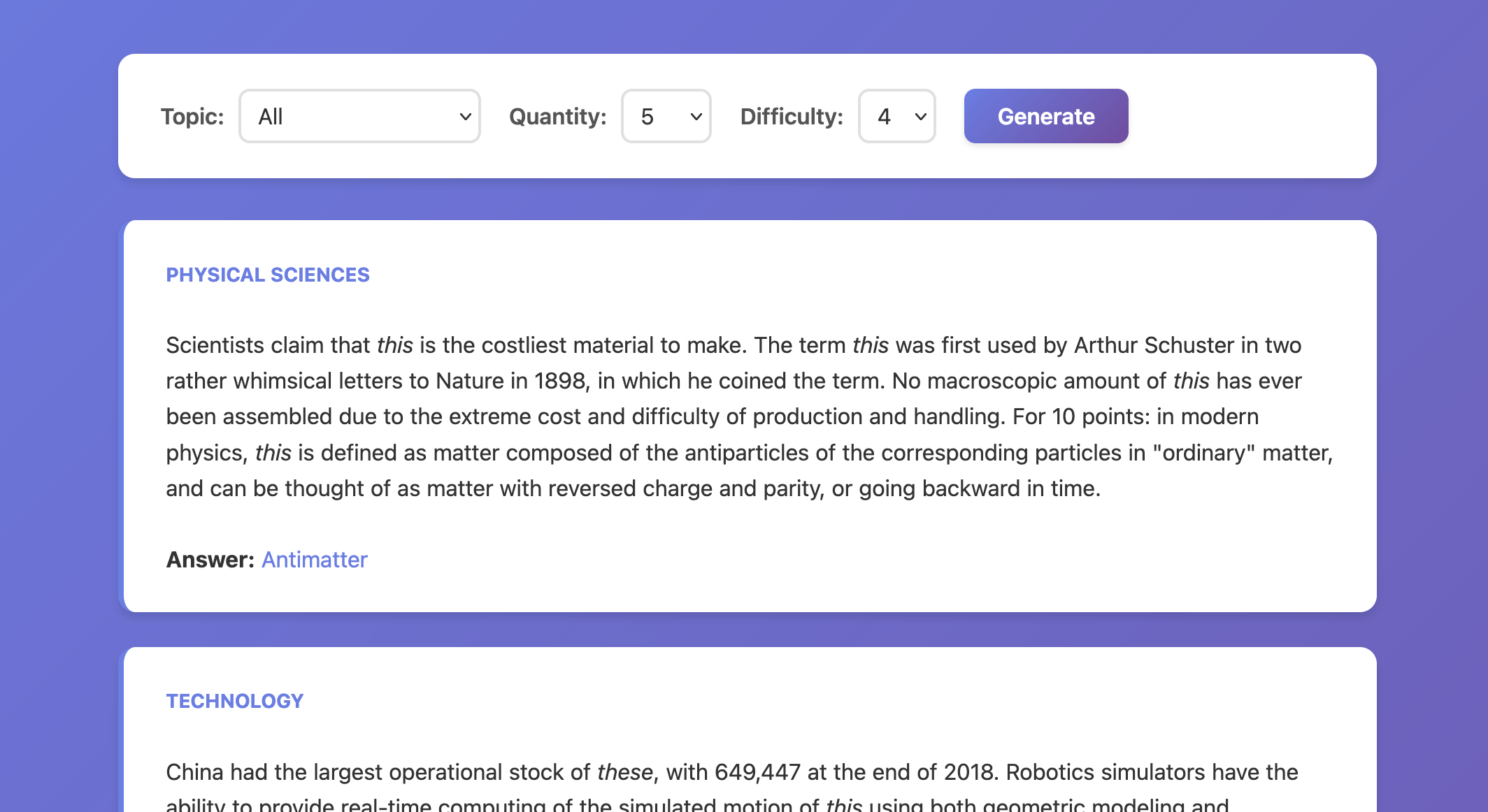 This web app generates quiz bowl packets using data from Wikipedia's ~50,000 vital articles.