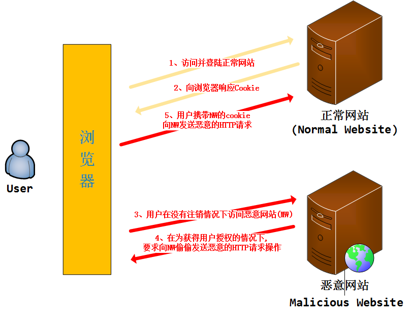 当我访问登录一个正常网站,成功访问后服务器会产生一个标识用户身份的cookie给用户的浏览器保存,在标识cookie还存在时访问恶意网站,在该网站里攻击者会让你不知不觉的访问之前的正常网站并且执行一些操作,由于标识用户身份的cookie还存在,所以用户浏览器认为是用户的本意操作而执行该请求,从而攻击成功。