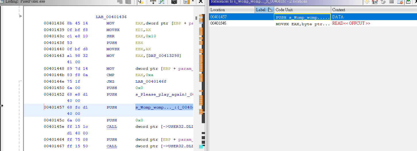 defined string -> Womp Womp -> reference -> show reference to address,可以找到 00401457 的位置