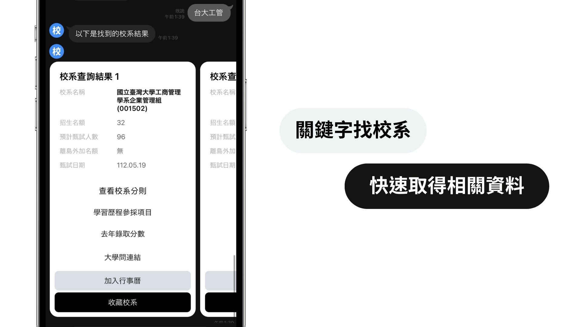 讓高中學生能透過 LINE 快速找到全台校系的簡章與申請資料,包含個人申請、繁星推薦與分科測驗,目前有 2.6 萬位使用者( 2023 / 11 / 1 更新 )