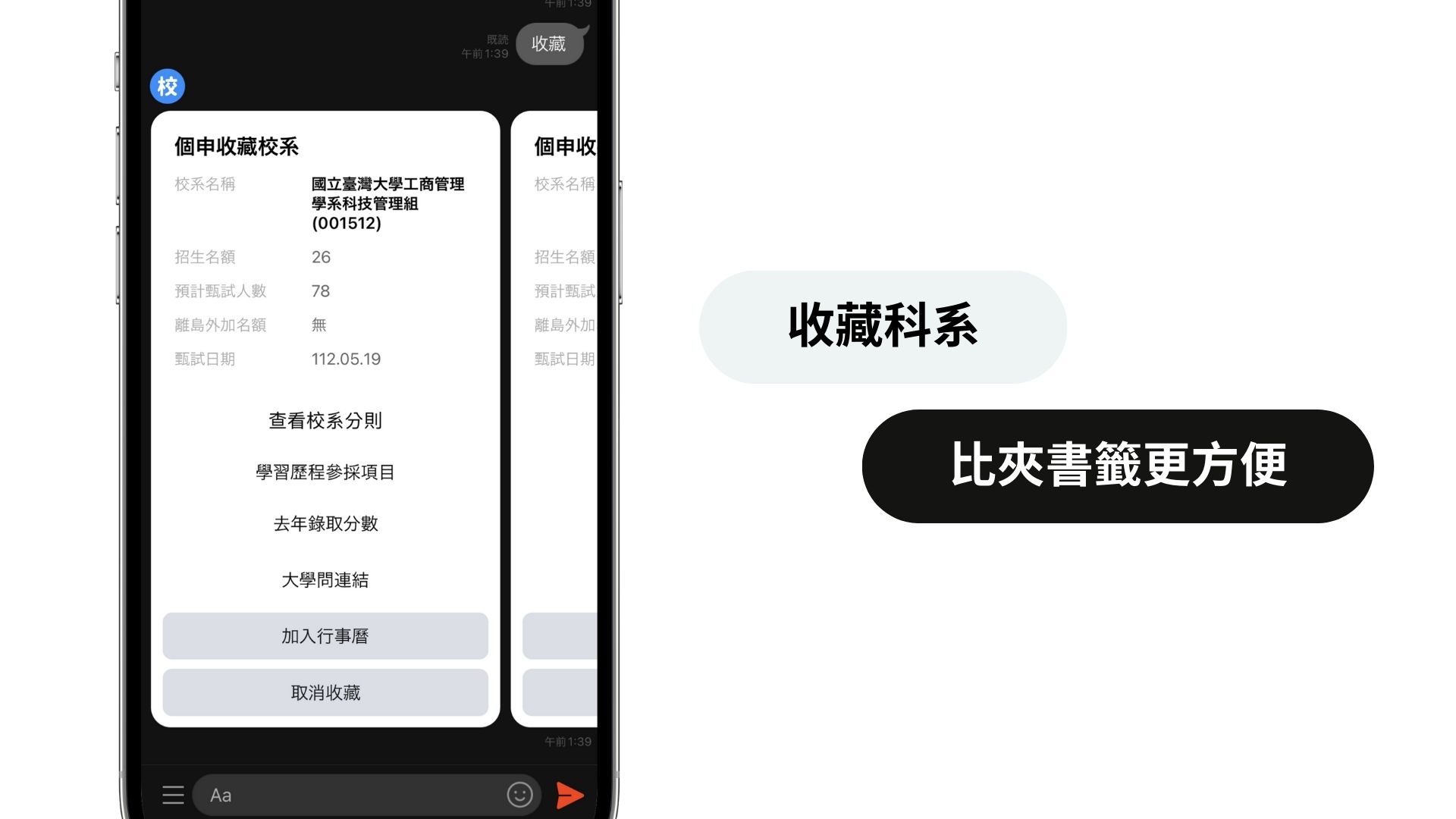 收藏有興趣的校系,傳送「 收藏 」即可一次找出所有目標校系: